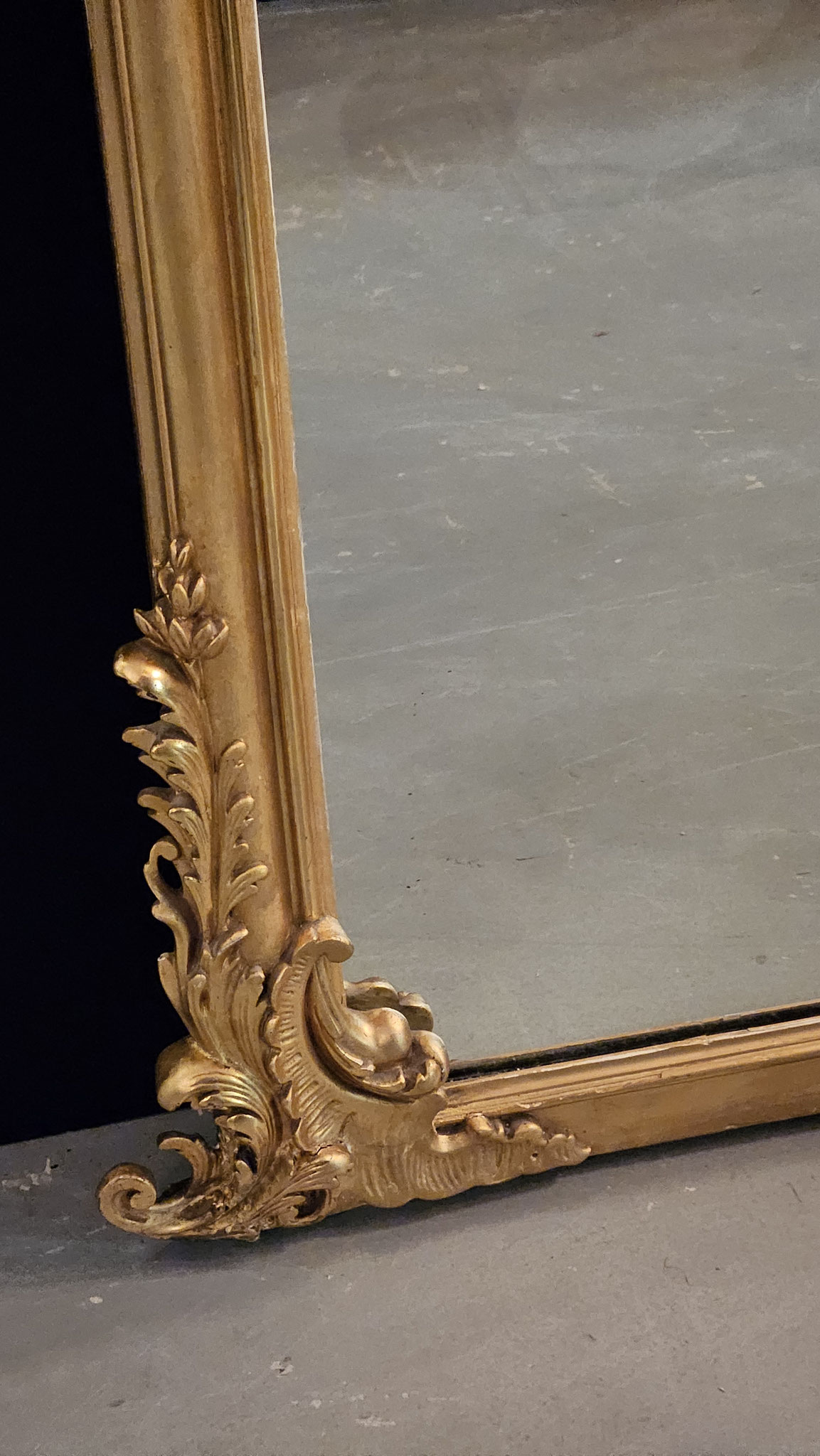 Deze imposante spiegel heeft het originele, antieke spiegelglas, waarin subtiele sporen van ouderdom zichtbaar zijn – een charmant teken van zijn authentieke karakter. De deels vergulde lijst