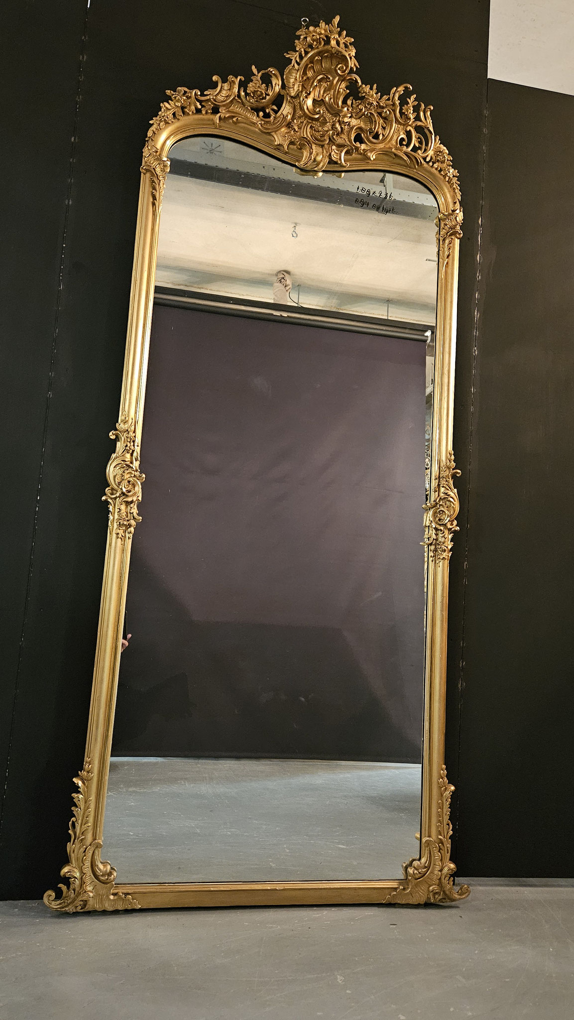 Deze indrukwekkende staande spiegel is voorzien van het originele kwikspiegelglas, dat enkele kleine beschadigingen in het kwikzilver vertoont, wat de authentieke uitstraling van het stuk versterkt.